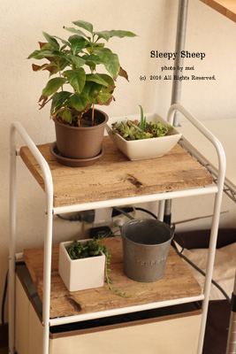 そのままの木の色合いでいいかなと思って置いてみたら、白のラックとグリーンによく合う!