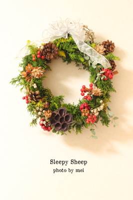 最初材料見たとき、赤!緑!といかにもクリスマス!という色合いに、あまり好きじゃないかも~;と思いました。ほんとはドライフラワーのようなくすんだ色合いのリースが作ってみたかったので。