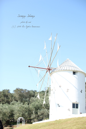 ギリシャの風車が目印です。とってもかわいい!無理言って近くまで撮影に行ってきました。青々とした空ととても合います。