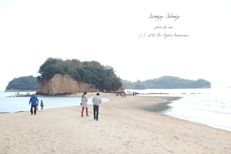 しかし直前で出てしまい、次の便まで待ち時間が一時間半… 港の近くの景勝地。エンジェルロードに行ってきました。潮の干満により道があらわれたり海に消えたりする500メートルほどの砂州です。 恋人たちの聖地です(by桂由美)。 うん、寒かった。